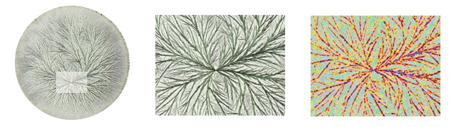 Left: original scanned crystallisation image. Middle: enlarged detail. Right: characterization of the local crystal widths in 15 width categories.